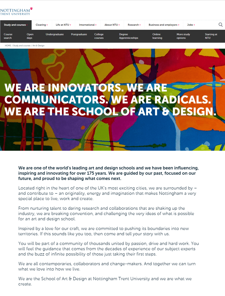 Nottingham School of Art & Design landing page